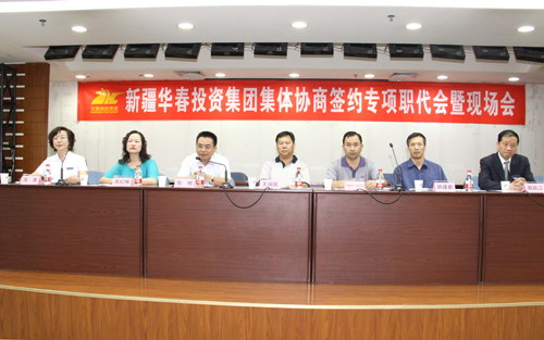 6月15日上午,對于新疆華春投資集團全員來說,是個神圣的日子,在我們偉大的中國共產黨成立90周年的前夕,在全社會著力構建和諧、改善民生的關鍵時刻,作為高新區(新市區)簽訂三項集體合同的重點示范企業新疆華春投資集團集體協商簽約專項職代會暨現場會,在高新區管委會5樓多功能廳隆重舉行!自治區總工會、烏魯木齊市總工會和高新區(新市區)區委領導出席會議,高新區(新市區)轄區內各主要企業派代表前來觀摩,共同見證了受華春投資集團法定代表人委托的企業方代表周躍江先生和職工方的代表華春投資集團工會主席高青同志,簽訂“三項合同”即《集體合同》、《工資集體協議合同》和《女職工權益保護專項集體合同》。