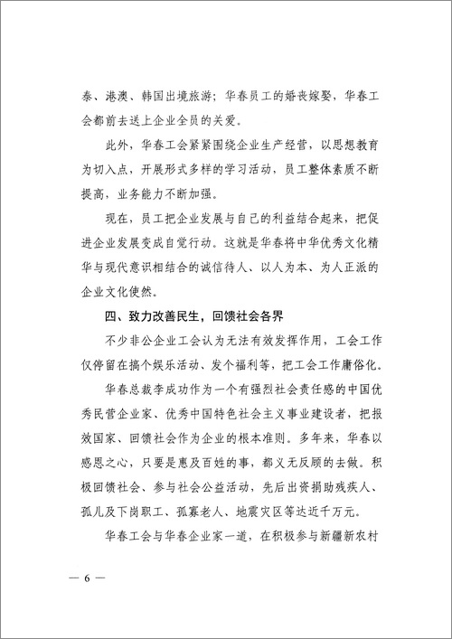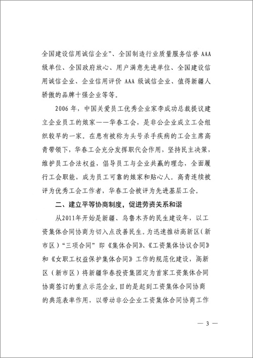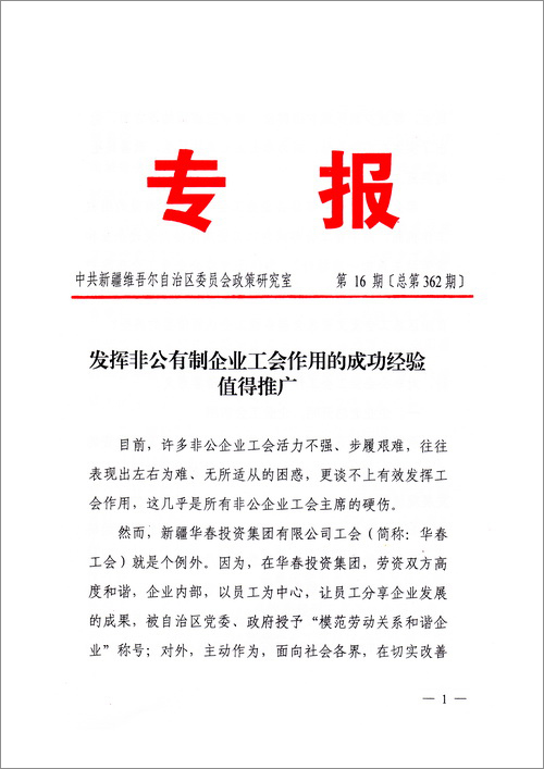 近日,自治區(qū)黨委政研室對新疆華春投資集團工會委員會的典型成功經(jīng)驗進行了深入調(diào)研,發(fā)了題為《發(fā)揮非公有制企業(yè)工會作用的成功經(jīng)驗值得推廣》的專報。結(jié)論是:新疆華春工會的實踐證明,非公企業(yè)工會有干不完的工作,不是可有可無,而是大有可為!這是在自治區(qū)黨委這個層面上,首次對全疆非公有制企業(yè)工會的肯定。