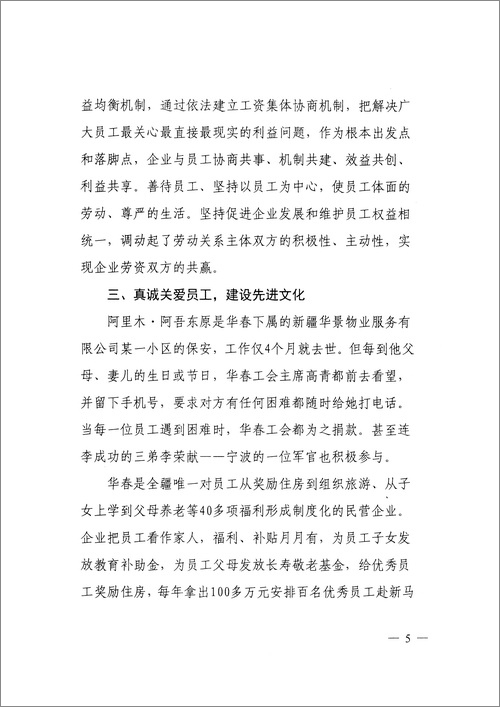 專報認(rèn)為:新疆華春工會就是個例外。對內(nèi),建設(shè)規(guī)范有序、公正合理、互利共贏、和諧穩(wěn)定的社會主義新型勞動關(guān)系,促進企業(yè)發(fā)展,維護員工權(quán)益,率先簽訂工資集體協(xié)商合同,勞資雙方高度和諧,實現(xiàn)企業(yè)與員工的雙贏,被自治區(qū)黨委、政府授予“模范勞動關(guān)系和諧企業(yè)”稱號;