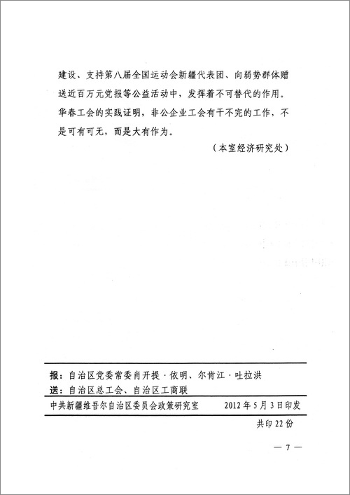 自治區(qū)黨委專報——高度肯定華春工會的成功經(jīng)驗