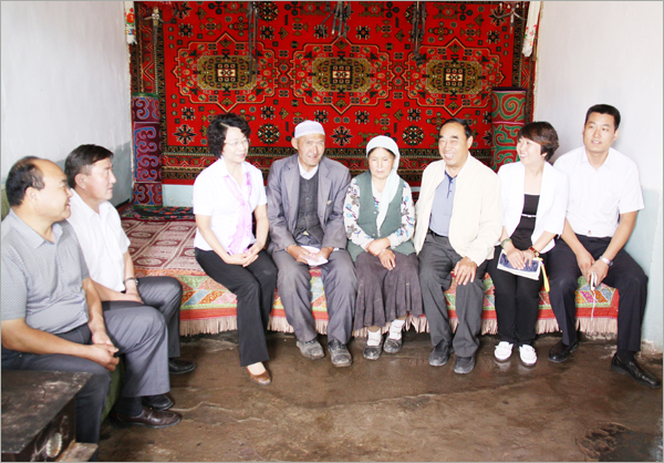 華春慰問組與五家渠師市有關(guān)領(lǐng)導(dǎo)在北塔山牧場(chǎng)負(fù)責(zé)人的陪同下,驅(qū)車先后來到下面的各牧業(yè)連隊(duì),慰問那里的困難牧民。那些受到華春資助的困難牧民家庭,當(dāng)接過華春慰問組給他家送來的500元慰問金時(shí),感動(dòng)得一時(shí)不知說什么好。對(duì)于他們素不相識(shí)的華春,卻特地在他們過節(jié)之前,來到他們都極少走出去的山溝,給予他們資金上的幫助。北塔山牧場(chǎng)畜牧二隊(duì)的卡斯木別克•努熱阿合麥提、牧場(chǎng)畜牧一隊(duì)的蘭黑恩•薩納提等牧民,一定要華春慰問組人員留下喝茶,要把過節(jié)的羊宰了招待華春人??吹饺A春慰問組人員謝絕而要離開他們時(shí),緊緊握著華春慰問組人員的手。