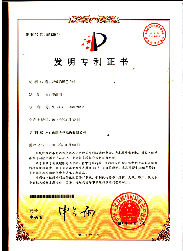 近日,經國家知識產權局評審,新疆華春毛紡有限公司申請的“青絨的脫色方法”技術創新成果,喜獲國家發明專利,專利號為 ZL 201410084892.8。
