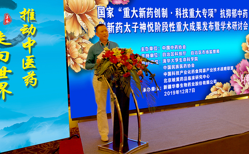 新疆自治區(qū)衛(wèi)生健康委黨組成員、副主任周美林在講話中說(shuō):自治區(qū)黨委、政府也高度重視中醫(yī)藥工作,陳全國(guó)書(shū)記對(duì)貫徹落實(shí)《中共中央  國(guó)務(wù)院關(guān)于促進(jìn)中醫(yī)藥傳承創(chuàng)新發(fā)展的意見(jiàn)》和全國(guó)中醫(yī)藥大會(huì)精神作出了重要指示,進(jìn)行了安排部署,我委按照自治區(qū)黨委政府要求也在為召開(kāi)自治區(qū)中醫(yī)藥大會(huì)進(jìn)行積極籌備。通過(guò)多年艱辛努力,由清華大學(xué)、新疆華春生物藥業(yè)股份有限公司共同研發(fā)的抗抑郁中藥創(chuàng)新藥“太子神悅膠囊”,是自治區(qū)獲得“十三五”國(guó)家重大新藥創(chuàng)制科技重大專項(xiàng)的中藥創(chuàng)新成果,其取得的階段性重大成果、擁有的自主知識(shí)產(chǎn)權(quán),必將對(duì)推動(dòng)自治區(qū)中醫(yī)藥科技創(chuàng)新和現(xiàn)代化發(fā)產(chǎn)生重大意義。本次科技成果發(fā)布會(huì),將是對(duì)我們新疆本土藥企中醫(yī)藥自主創(chuàng)新能力和科研實(shí)力的一次全面展示;同時(shí)通過(guò)學(xué)術(shù)研討,也為來(lái)自國(guó)內(nèi)中醫(yī)藥專家學(xué)者針對(duì)精神性疾病領(lǐng)域的中醫(yī)藥科研成果進(jìn)行深入交流提供了難得的交流機(jī)會(huì)和平臺(tái),將對(duì)促進(jìn)我區(qū)精神性疾病中醫(yī)藥診療、新藥研發(fā)進(jìn)步發(fā)揮重要的作用。