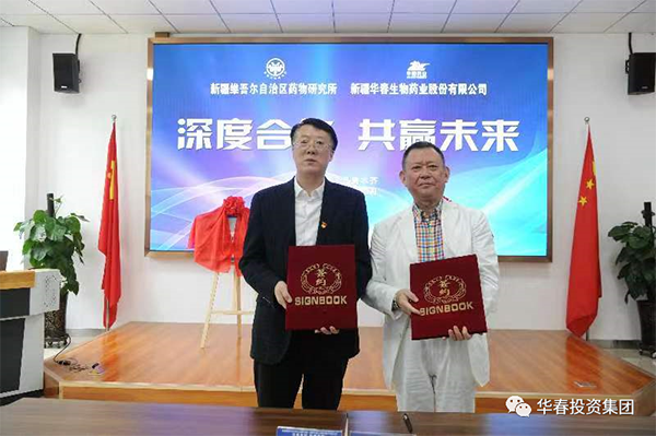 新疆華春生物藥業股份有限公司與自治區藥物研究所于4月 28日簽訂了深度合作協議,就雙方合作組建的新疆藥物研發中心華春生物藥業示范協同創新基地、烏魯木齊天山藥谷華春西部生物工程技術研究院舉行了揭牌。旨在更深層次多方面充分發揮雙方優勢,強強聯合,實現共贏。華春投資集團董事局李成功主席與自治區藥物研究所邢建國所長以及雙方的相關管理人員參加了簽約揭牌儀式。