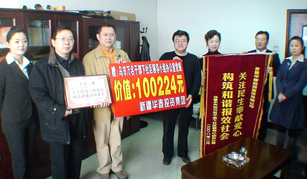 新疆華春投資集團為以實際行動落實黨的十七大關注民生、構建和諧社會的精神,為使社區及時了解到黨和國家的各項路線方針政策與有關新聞信息動態,同時感受社會各界對社區的親切關注,配合烏魯木齊市萬名干部下社區的活動,在新春佳節即將到來之際,出資10萬余元,訂購全年的《新疆經濟報》348份,于2月1日贈送到烏魯木齊市萬名干部下社區領導小組辦公室,將黨報贈送到市委市政府直接聯系的社區,為基層社區提供精神食糧。