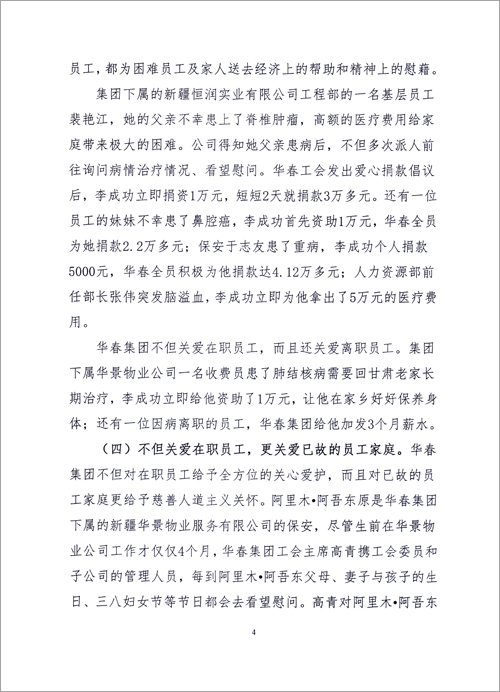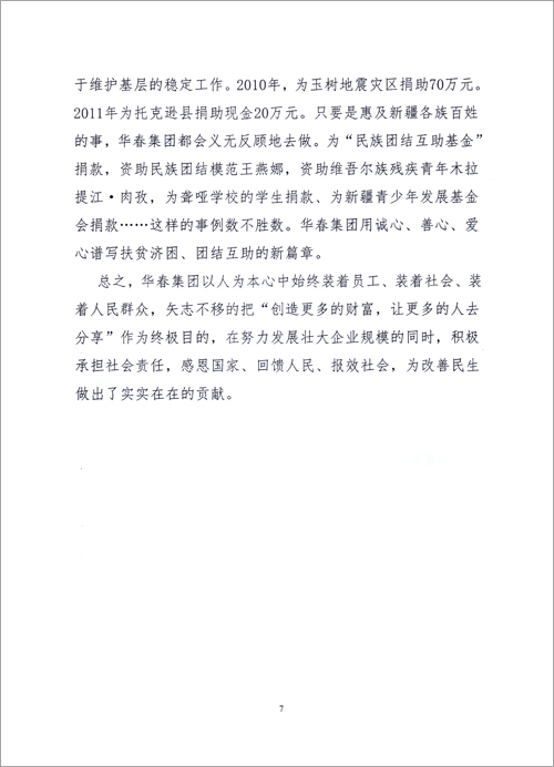 華春投資集團成立17年來,作為一個有社會責任感的民營企業,華春投資集團履行責任,積極參與公益事業,反哺社會,感恩各界,是新疆首家參與社會主義新農村建設的民企;是全疆向社會各界贈送價值高達幾十萬元的黨報、提供精神食糧的企業;是全國首家資助第八屆全國民運會新疆代表團的民企;華春投資集團是全疆對員工從獎勵住房到組織旅游、從子女上學到父母養老等40多項福利形成制度化的民營企業……