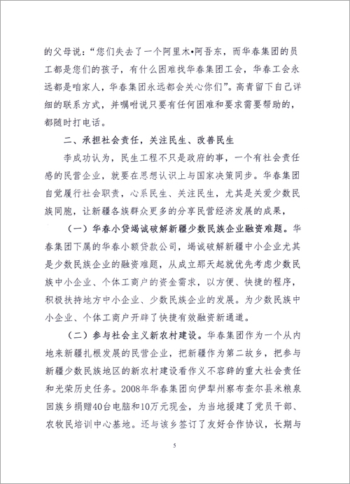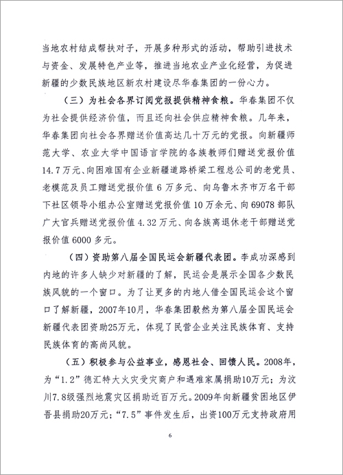 華春投資集團的決策者李成功總裁認為,民生工程不只是政府的事,非公企業要自覺履行社會職責,關注民生,心系民生,全力改善民生。李成功總裁在思想認識上與國家決策同步,不但讓企業員工分享企業發展的成果,而且讓新疆各族群眾分享非公經濟發展的成果,這已成為華春投資集團的常態。