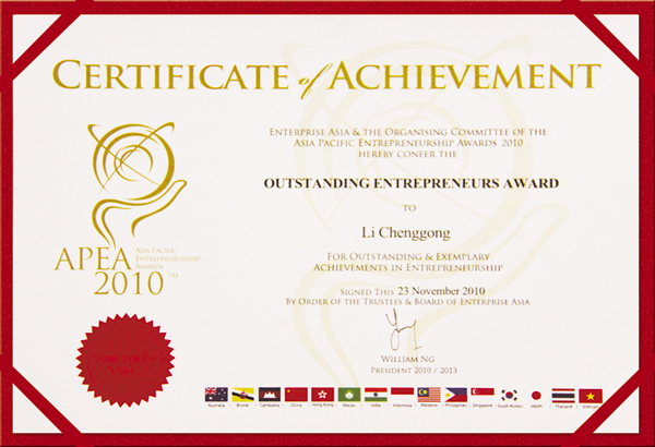 亞太企業精神獎(APEA),即對亞太區域內在建立成功企業過程中,以堅毅精神取得卓越成就、并注重企業社會責任的企業家們給予的最高獎項。亞太企業精神獎在中國是首次進行評選,經過半年的時間,通過對國內企業的層層篩選、實地考察、面對面的訪談,最終遴選出了符合APEA標準的企業,經過國際顧問委員會的綜合評審,評選出10位企業發展良好與盡心、盡責的卓越企業家。