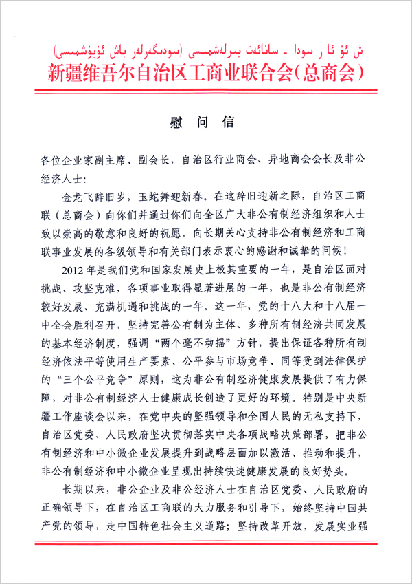 2013年1月17日,自治區工商聯黨組成員、自治區工商聯副主席努爾力•尤努斯和自治區工商聯光彩辦副主任陳風玫一行2人,春節前代表自治區工商聯主席及黨組來華春投資集團慰問企業家副會長李成功總裁并送上自治區工商聯黨組的慰問信和鮮花。