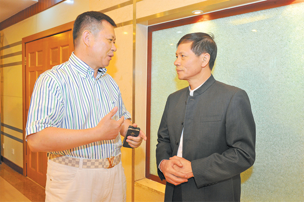 新疆華春投資集團有限公司董事局主席兼總裁李成功(左)與新疆法制報社社長蔡宇知探討企業法人治理結構話題。