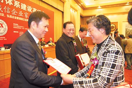 全國政協副主席張榕明給新疆華春投資集團董事局主席兼總裁李成功(左)頒發“中國十大誠信企業家”獎章證書。(圖片由采訪對象提供)