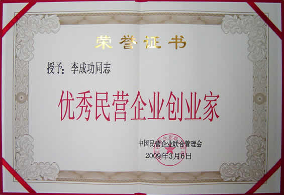 “優秀民營企業創業家”榮譽證書